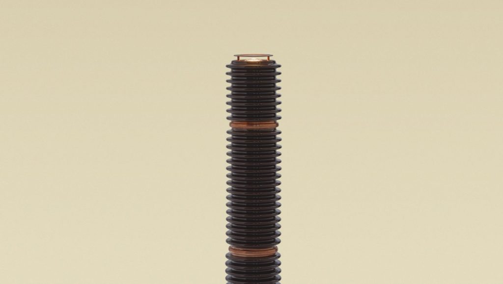 Rooted in the intersection of man and nature, this uncanny collection employs recyclable, metalized ceramic insulator modules — conventionally used in electrical grids and poles — to form ambient spotlights via a patented manufacturing process. Manifested as architectural lamps and pendants of varying length, the high-tech fixtures represent a harmonious union of object, earth and universe. Their organic volcanic forms emit a warm glow from a dimmable LED bulb diffused by an embedded lens. Reminiscent of lava or fire, it bestows the designs and the surrounding space with a simultaneously terrestrial and otherworldly aura.