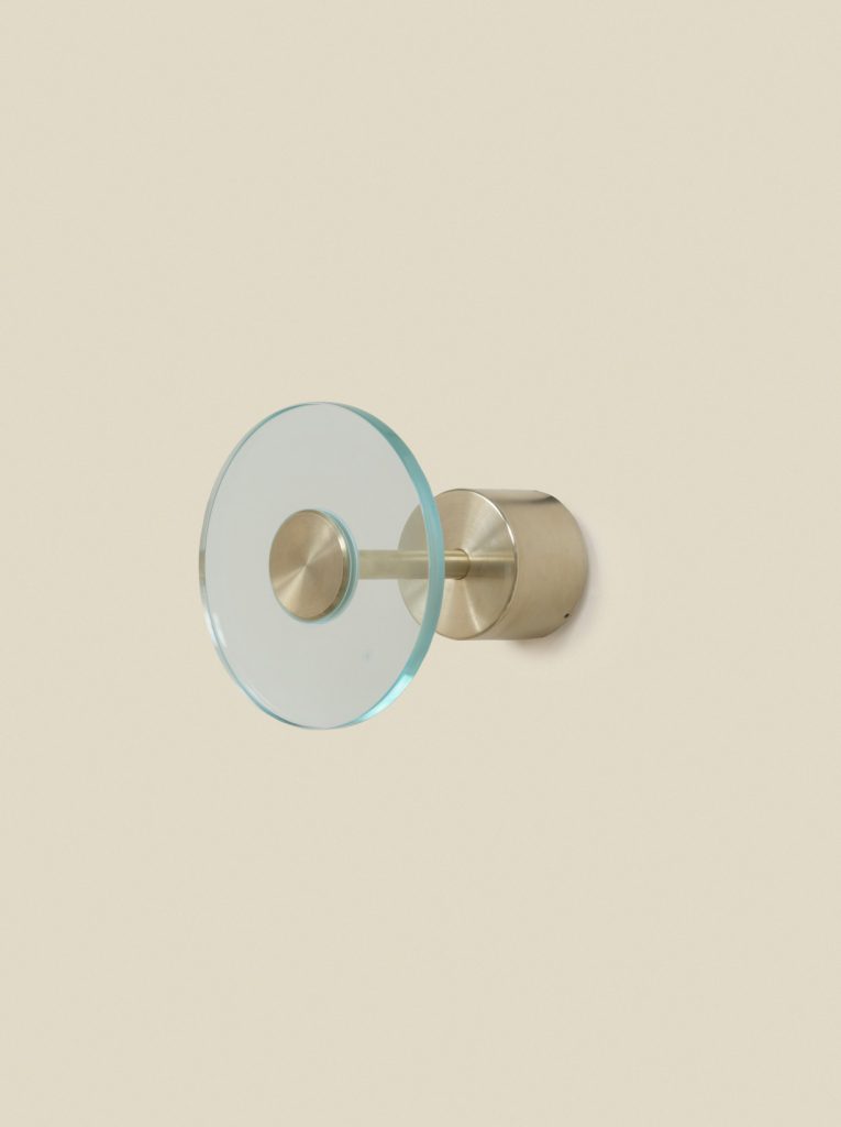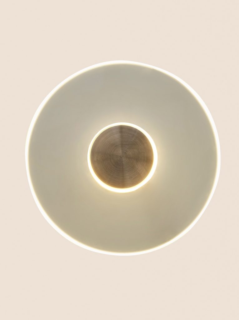 Taking the shape of the universe to its logical conclusion, this emblematic lighting collection is constructed exclusively of circles — from the form of its principle design elements to the screws that secure them in place. Universal symbols of totality, perfection and timelessness, the spheres also express the cyclical expansion and contraction of the cosmos and the immutable center that anchors this infinite process. A brass base forms the physical center of each design, weighting a vertical rod affixed with an industrially CNC-routed spherical glass diffuser. Internally illuminated by a custom LED circuit, each disc emits an ethereal glow.